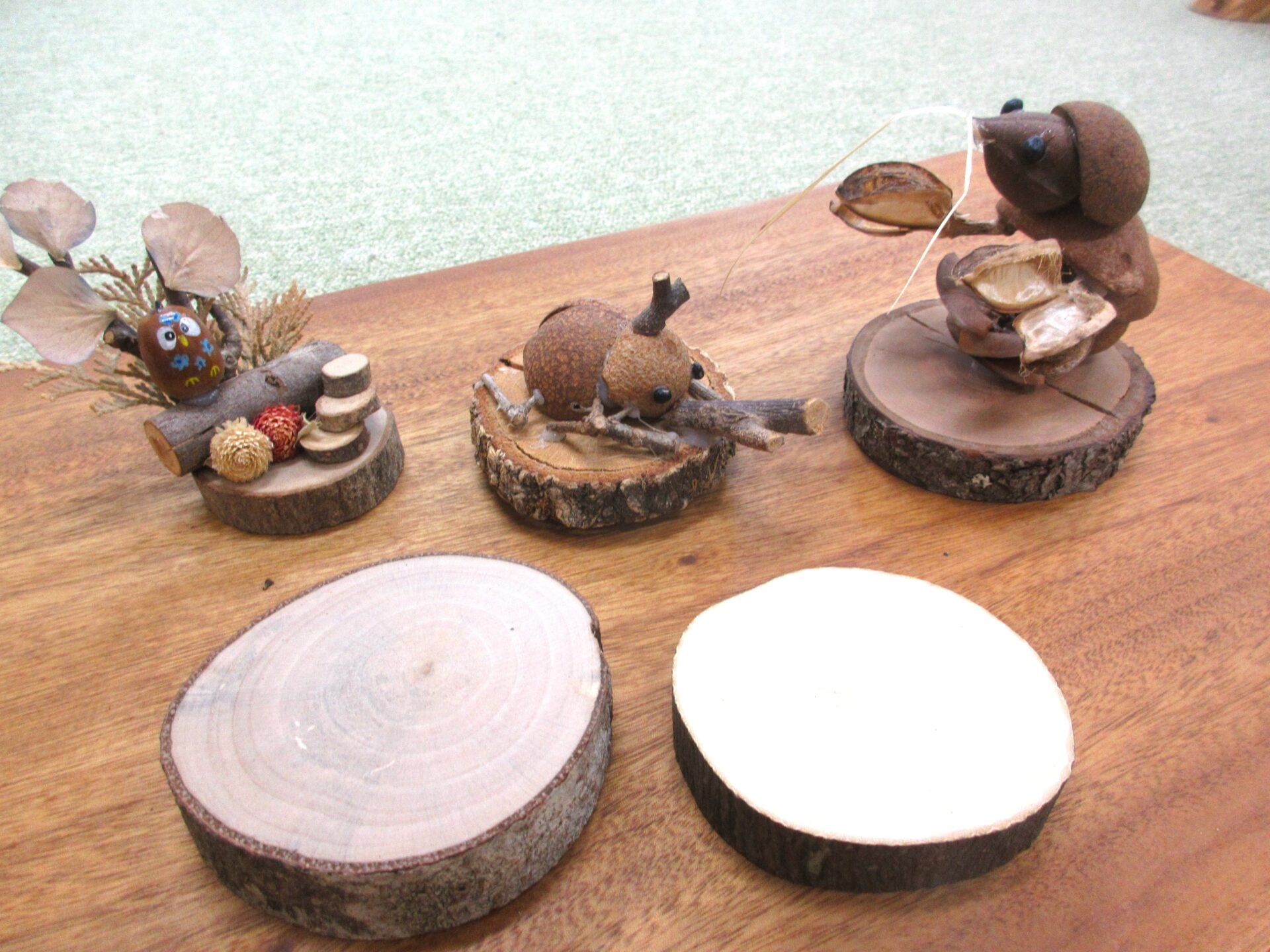 木の種類によって色が違ったり、香りがするものもあります。それぞれの木の違いを発見しながら、土台の丸太を選ぼう!選んだ丸太の上に木の実など森の材料を使って自由に飾り付けが出来ます。丸太の直径は6~9cmほどです。