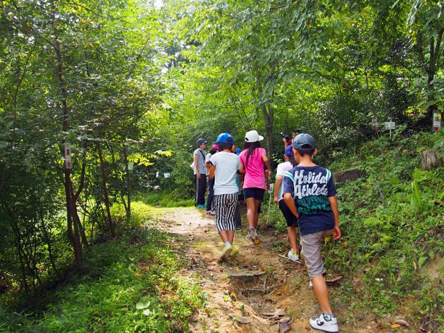 施設の向かい側には、散策ができる「もくもく村の森」があります。約1200本の佐賀県に自生する広葉樹などを植栽した森は、様々な植物や昆虫、野鳥などを観察することができます。また、少し登ると展望台があり、北山ダムや天気のいい日には背振山を眺めることができます。樹木の観察や、森林学習、生き物観察などのフィールドとして活用しています。
