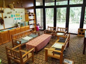 大きな窓から見える森の風景を楽しみながら、ゆったりとした時間を過ごすことができるスペースです。森の絵本や図鑑なども自由に読んでいただけます。飲食可ですので、お弁当を持って一息ついてみてはいががでしょうか。