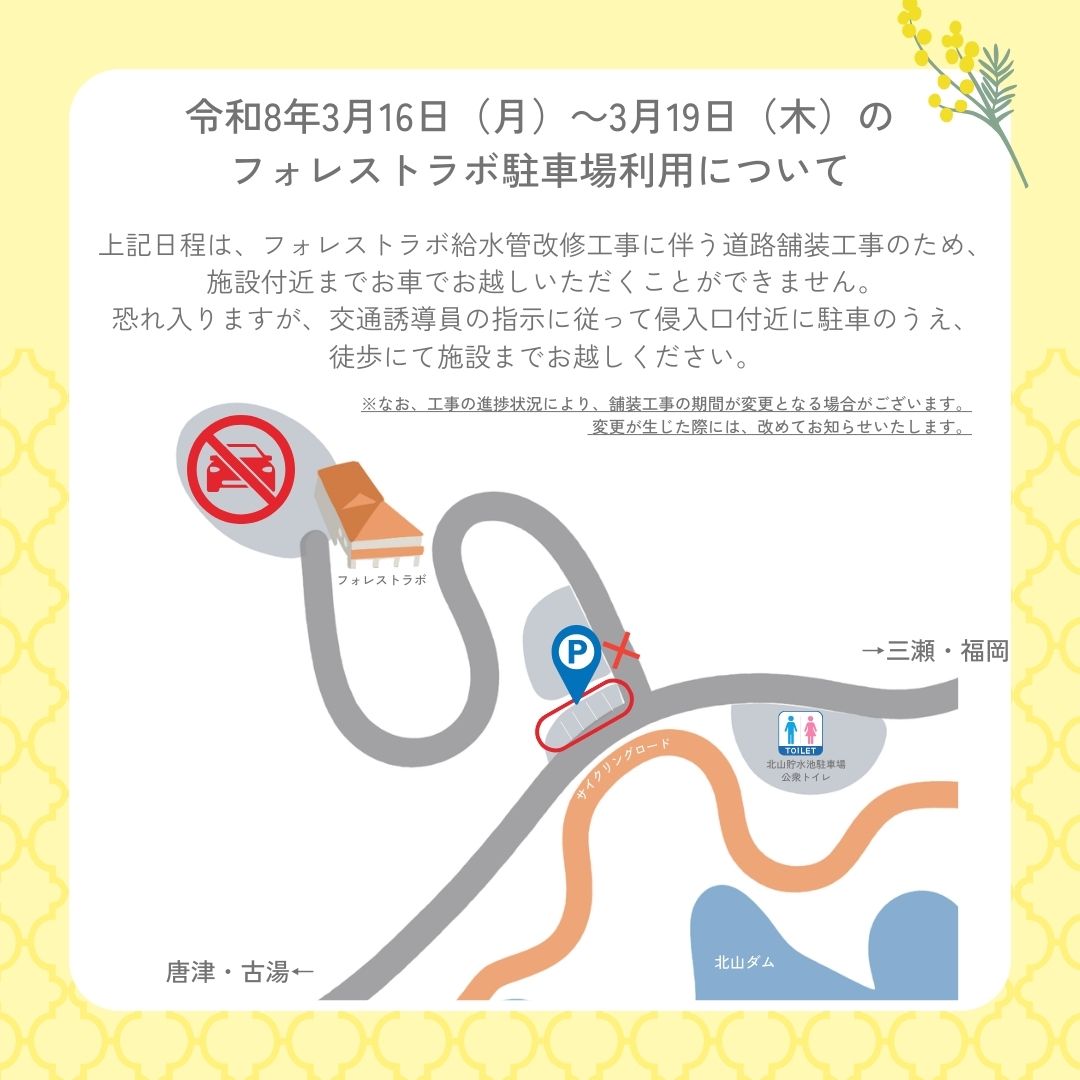 【令和8年3月16日(月)~3月19日(木)】の期間は、フォレストラボ施設付近までお車でお越しいただくことができません。