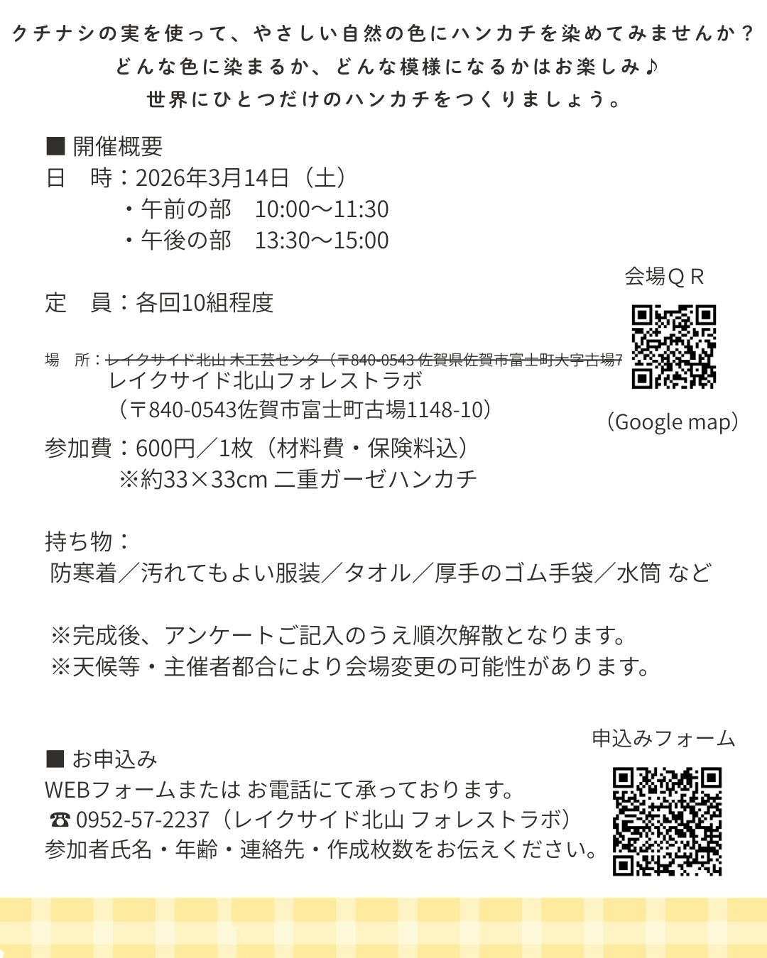 2026.3.14(土)「ハンカチのクチナシ染め体験」※会場変更あり
